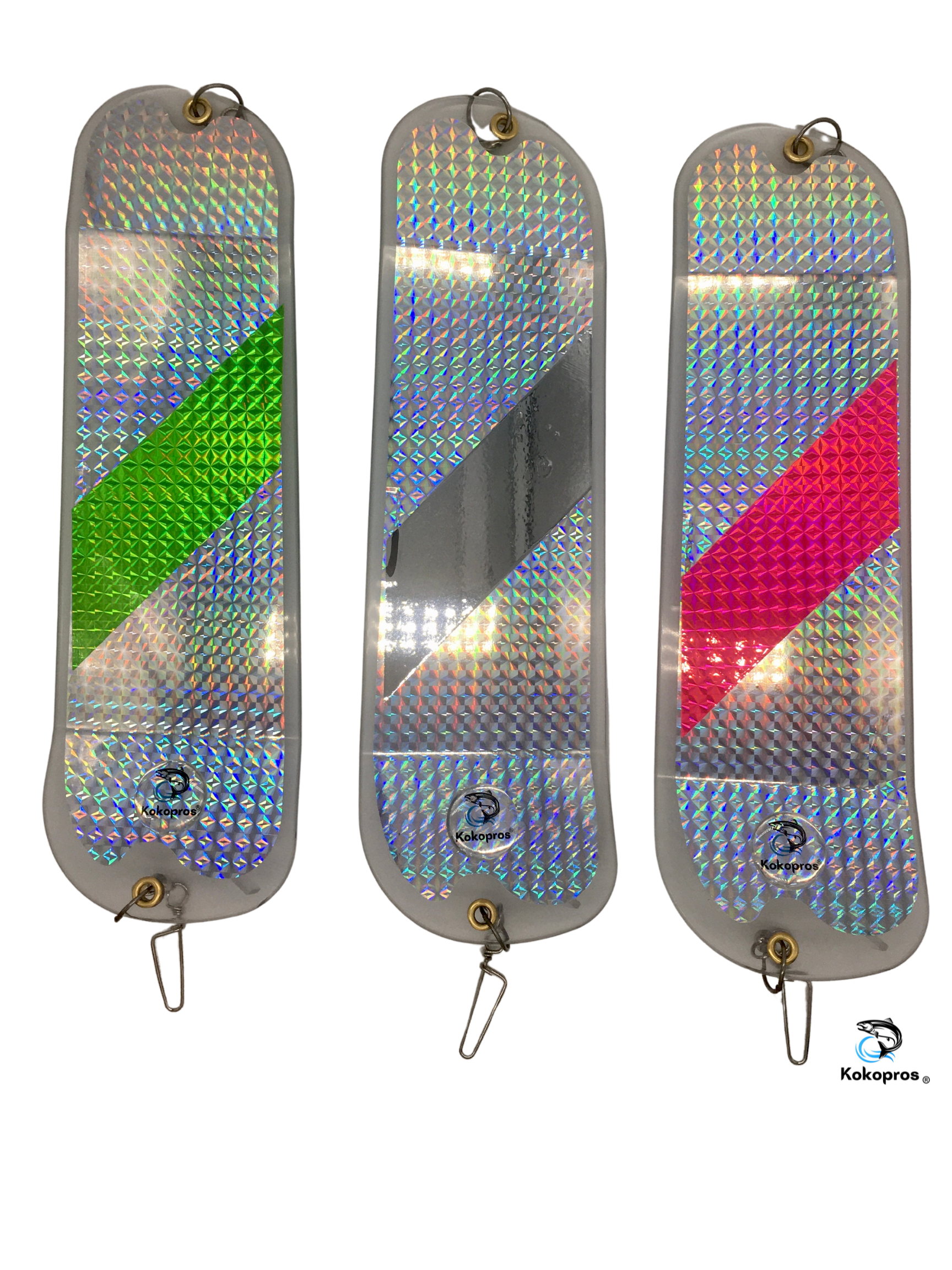 KOKOPROS® Salmon Trolling Striped Large 11- inch Holographic Salmon Flashers Striped Hot Pink , Green, Chrome, 3 PK Includes 360 Degree Rotation Fins- Heavy Duty Hardware.