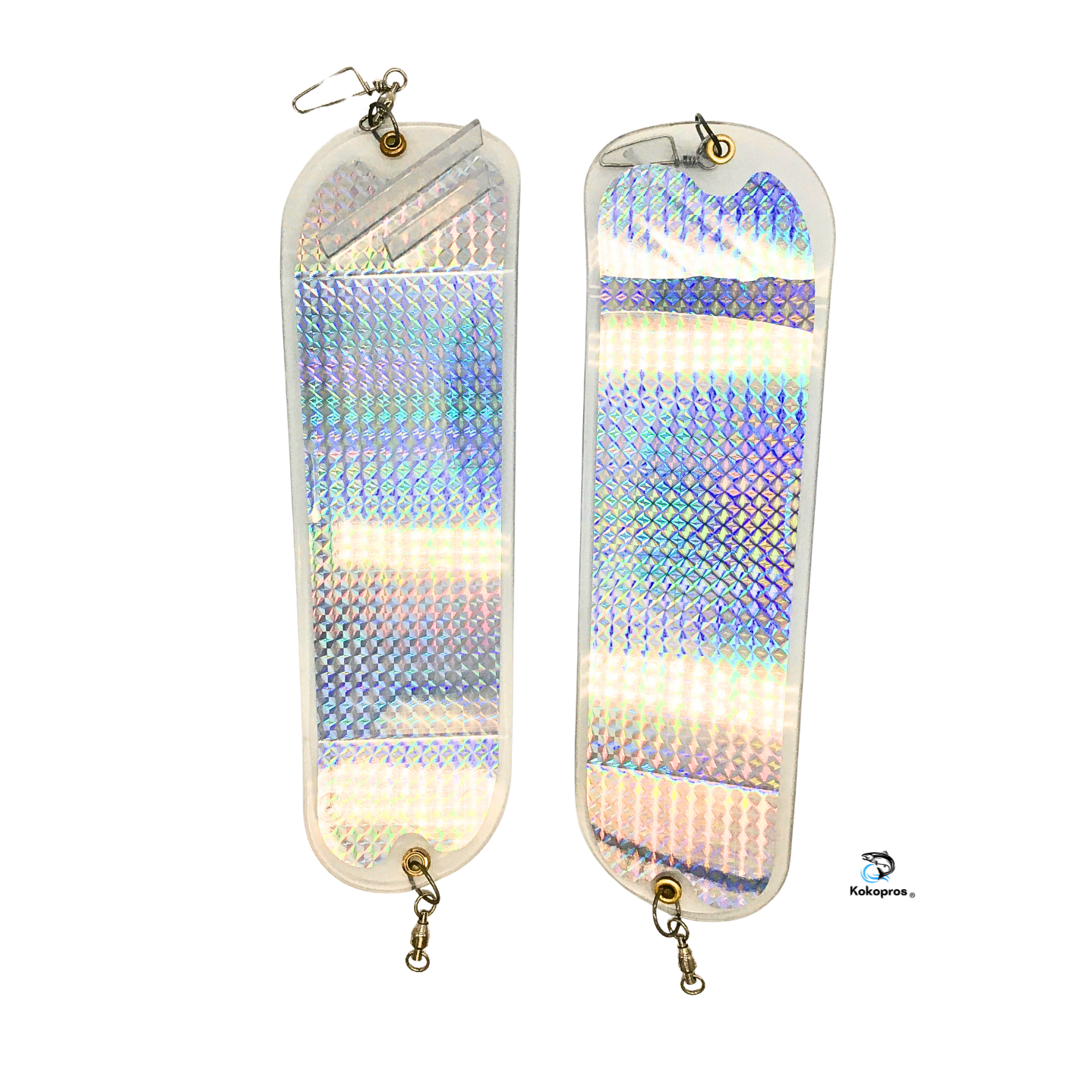 KOKOPROS® Salmon Trolling Large 11- inch Salmon Flashers Holographic Silver Machines 2 PK includes 360 degree Rotation Fins- Heavy DutyHardware.