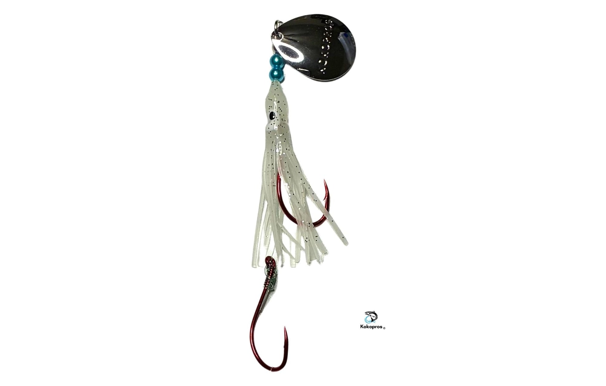 Salmon Tackle - Kokopros® Ghost White - 4/0 Snell Hook - Luminous Salmon Hoochie with Kokopros Spinner Blade. (SNELL