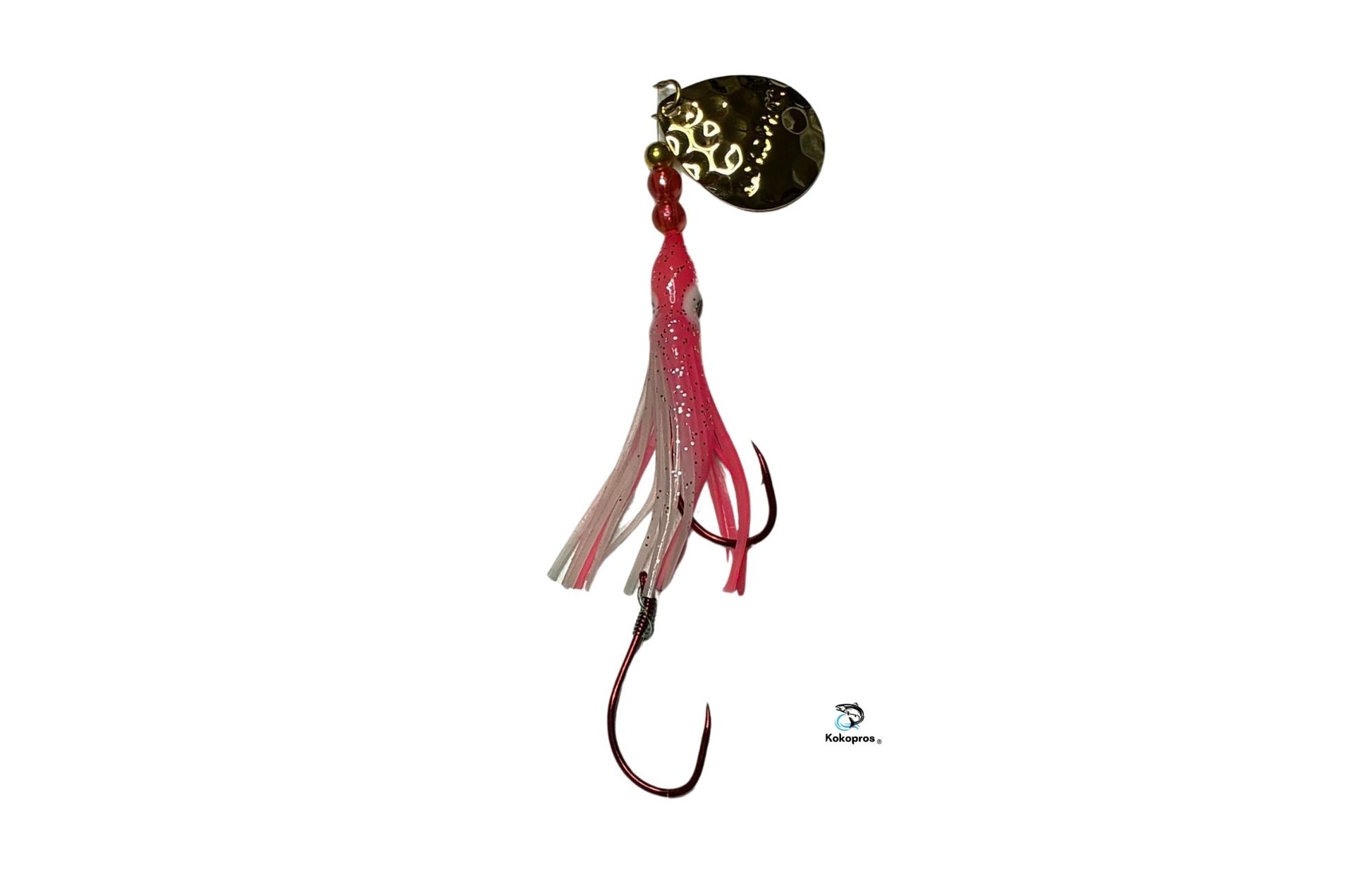 Salmon Tackle -Kokopros® - Luminous Salmon Hoochie Pink and White -4/0 Snells Luminous Salmon Hoochie and a Kokopros Spinner Blade /0 (SNELL)