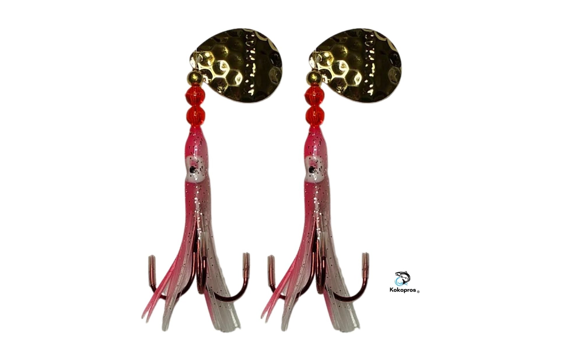 Salmon Tackle- Kokopros® Twin Pack Pink- White 2/0 Treble- Luminous Salmon Hoochie Kokopros Spinner Blade (TREBLE)