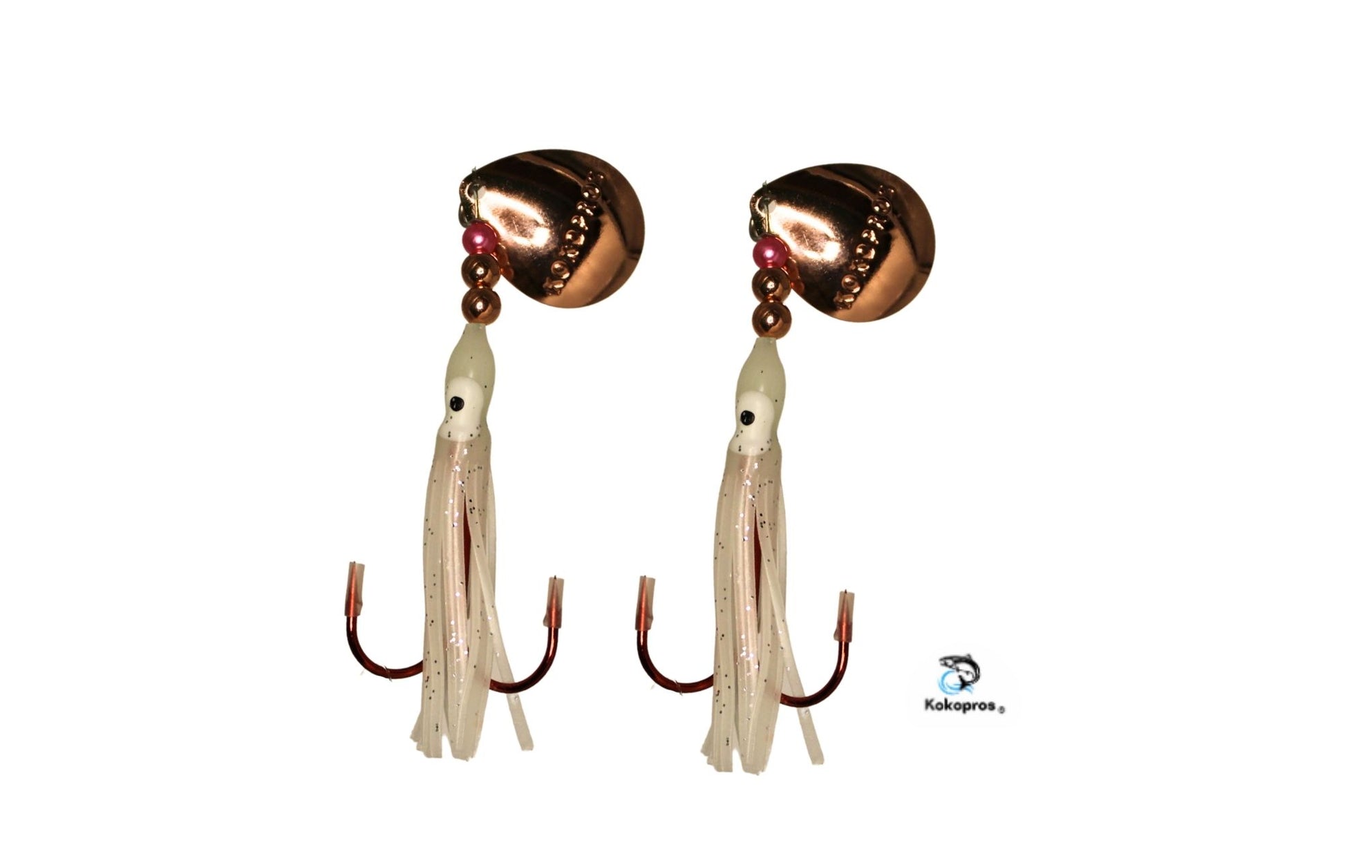 Salmon Tackle- Kokopros® Twin Pack Ghost White 2/0 Treble- Luminous Salmon Hoochie Kokopros Spinner Blade (TREBLE)