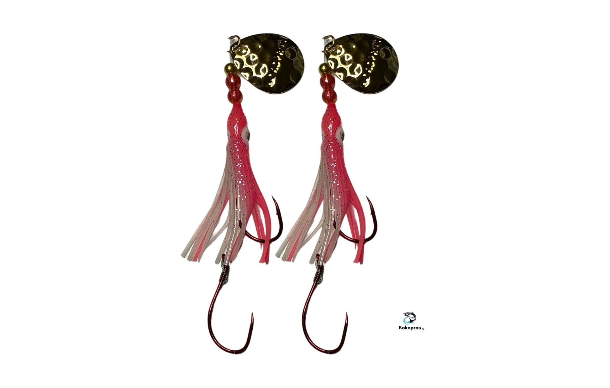 Salmon Tackle - Kokopros® Twin Pack Pink- White - 4/0 Octopus Snell-Luminous Salmon Hoochie Kokopros Spinner Blade (SNELL)